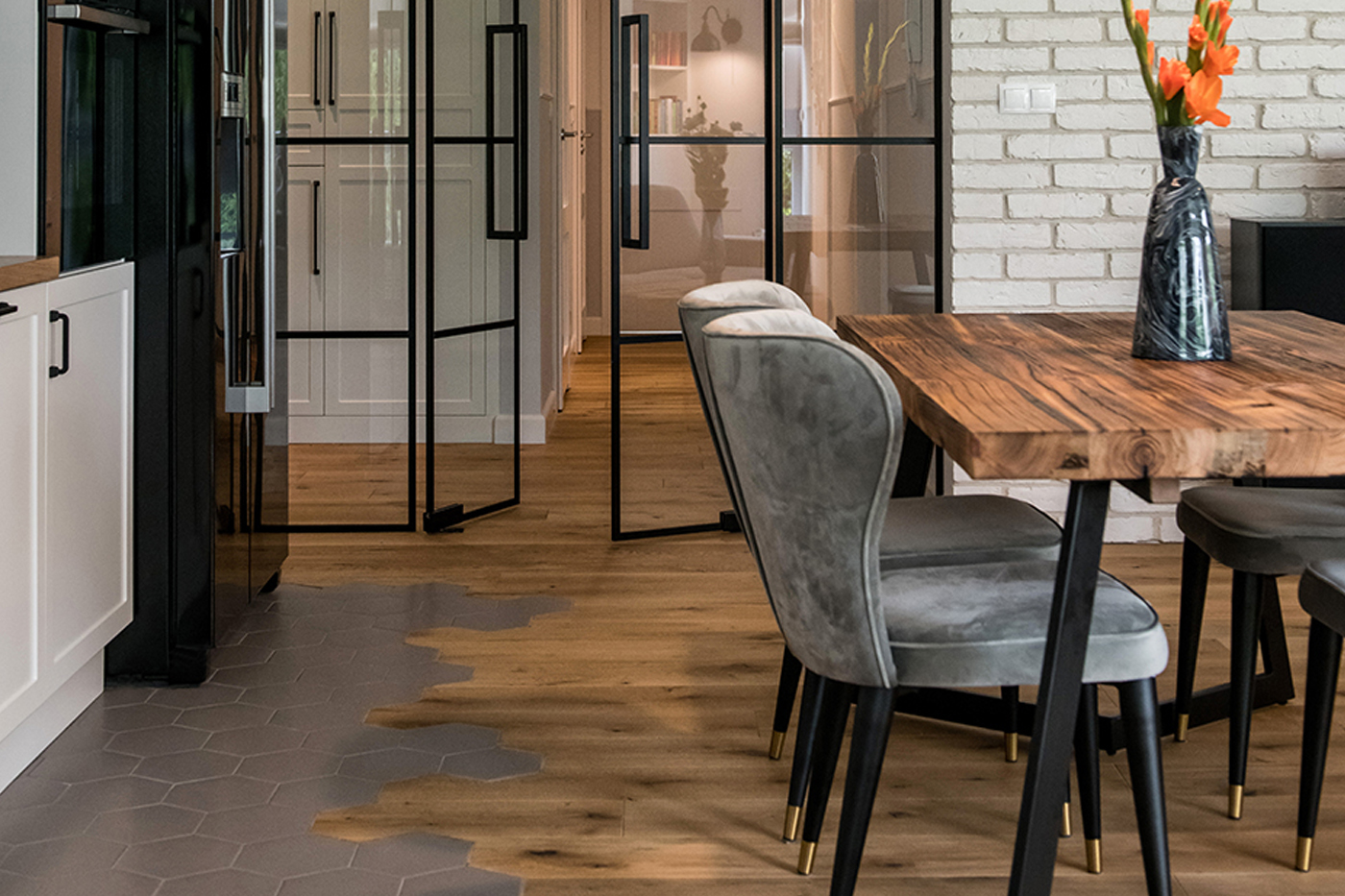 Хоча поєднання різних поверхонь може здаватися досить сучасним рішенням, воно чудово підходить для інтер’єрів у класичному або провансальському стилі. Наприклад, чудово виглядає поєднання шестикутної плитки та класичної дерев’яної підлоги. Дизайн: Deer Design