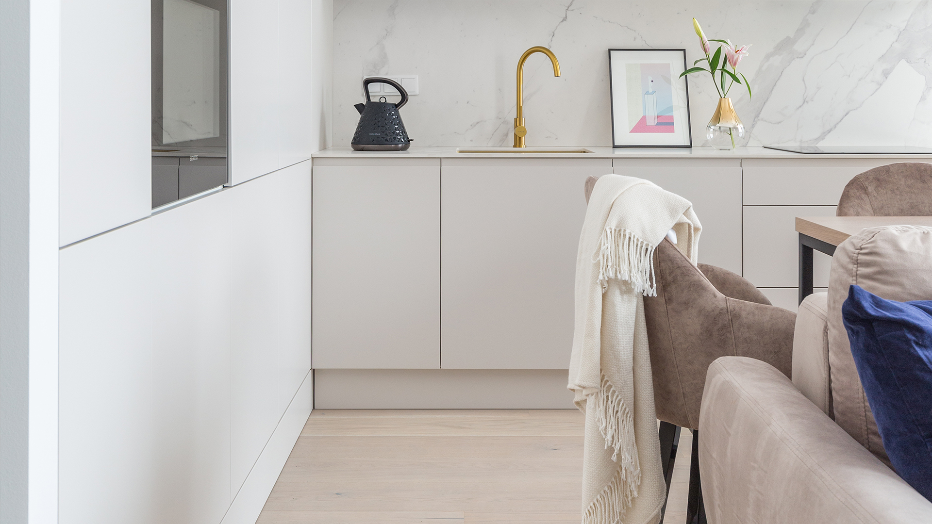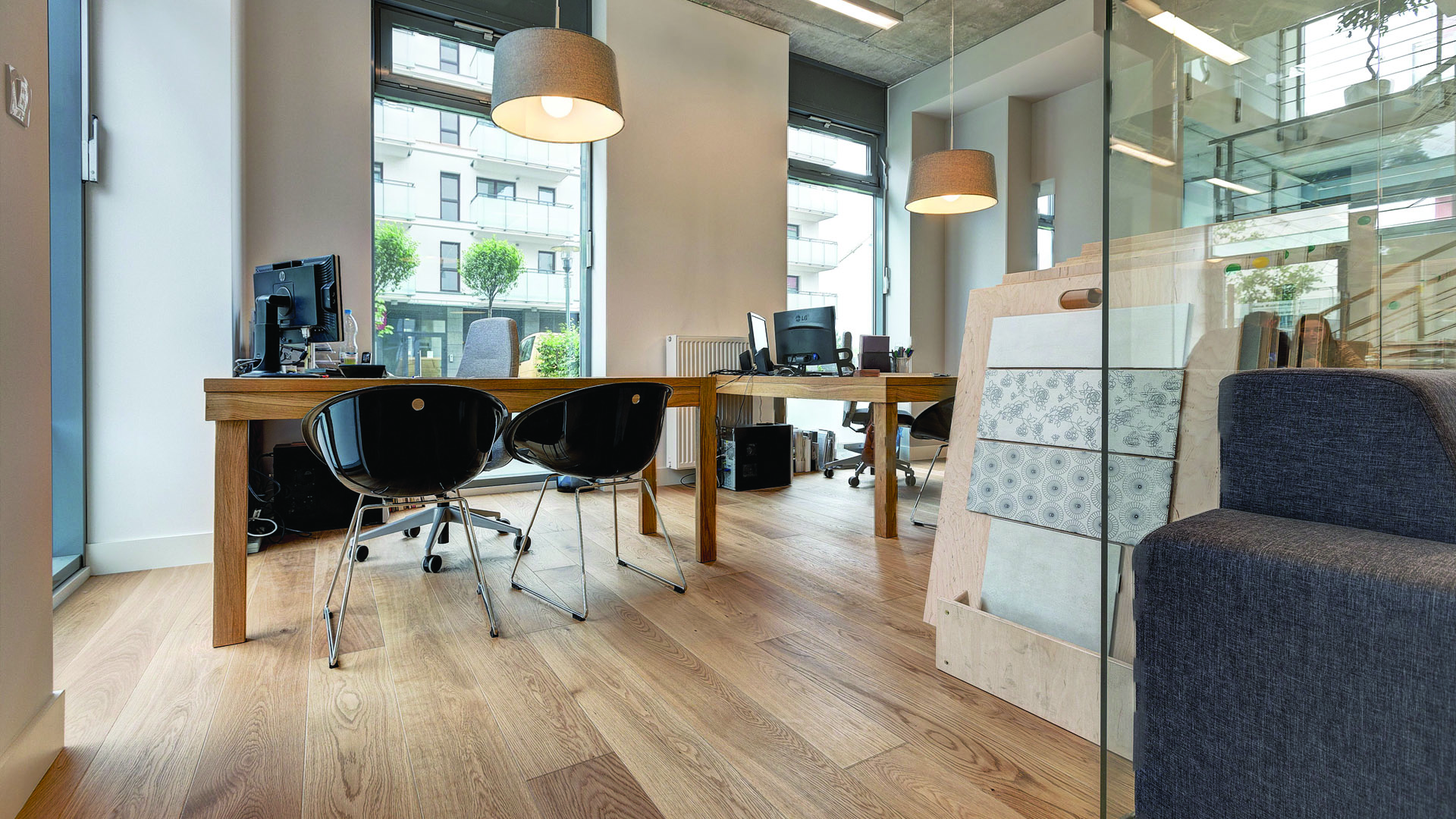 Червоний, фуксія, темно-синій або морський зелений та жовтий — це дуже виразні кольори, які інколи важко поєднати в інтер’єрі. Однак це не означає, що від них слід відмовлятися. Інтер’єр офісу, спроектованого Decoroom. На підлозі панує дошка «Барлінецька» з дуба «Gentle».