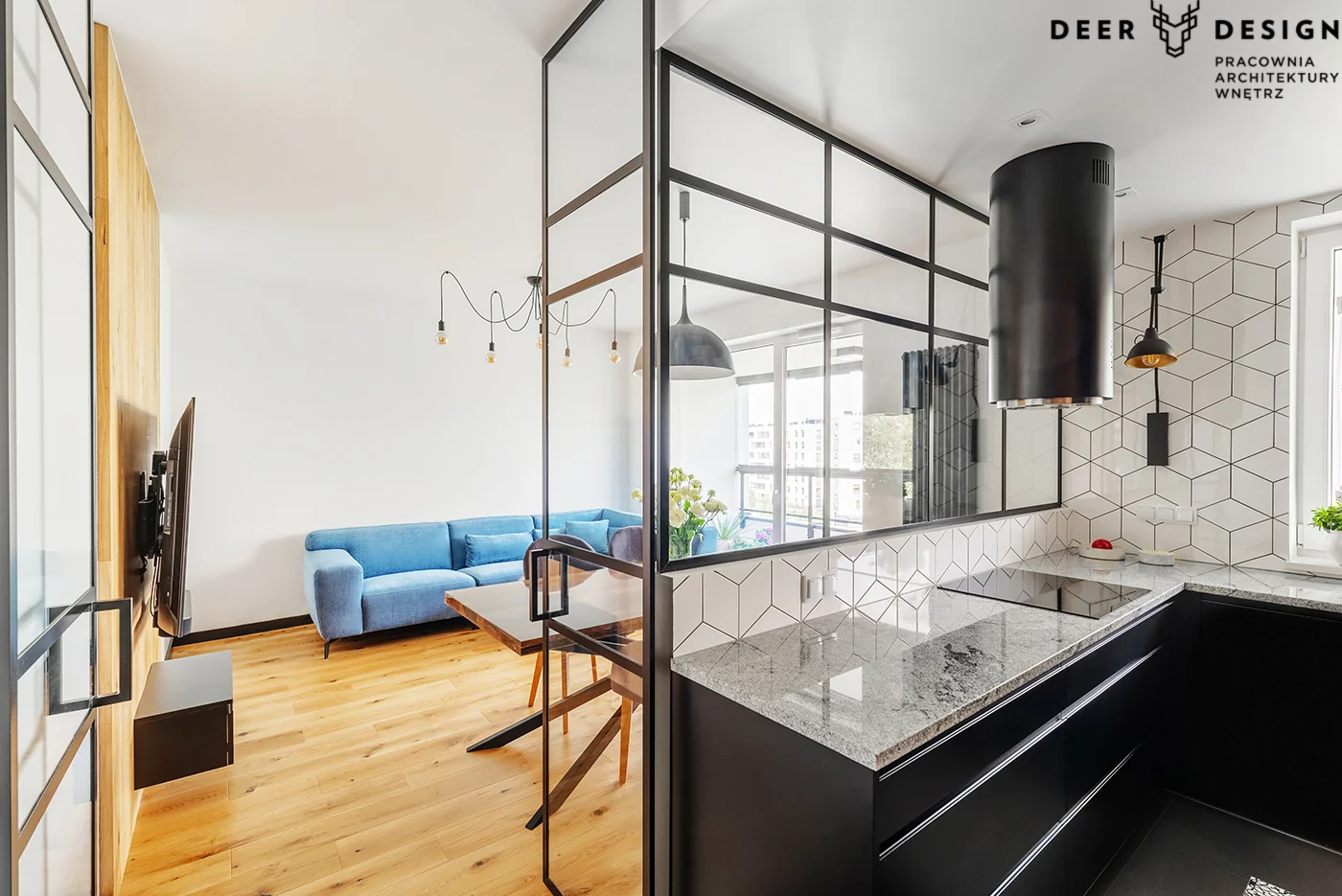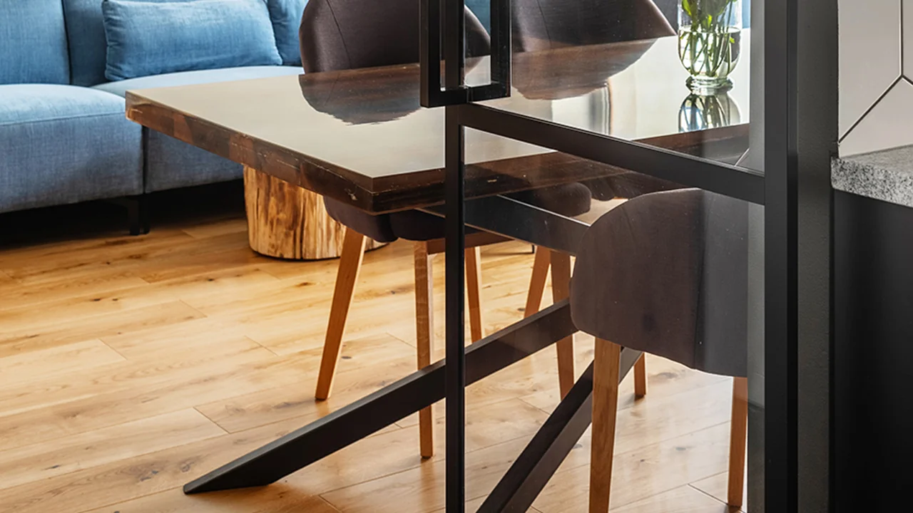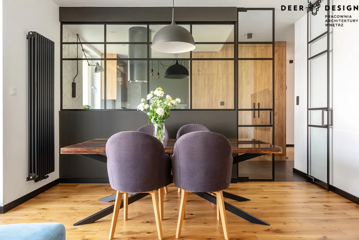 Вітальня з кухонним куточком стає дедалі популярнішим рішенням, особливо у невеликих квартирах. Таке рішення додає інтер’єру більше простору та світла. Кухонна та вітальня зони можуть бути повністю об’єднані або розділені, наприклад, острівцем чи скляними перегородками, як у проекті студії Deer Design. Тепло сучасного інтер’єру забезпечує дошка «Барлінецька» з дуба «Raisins Grande».