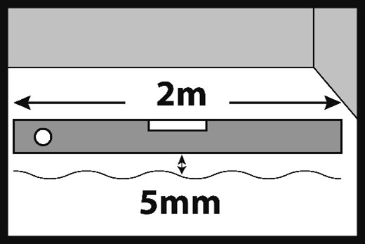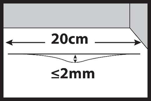 Максимально допустимі нерівності можуть становити до 5 мм, виміряні на довжині 2 м. Локальні/місцеві нерівності не повинні пере-вищувати 2 мм на довжині 20 см.