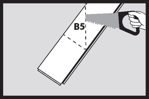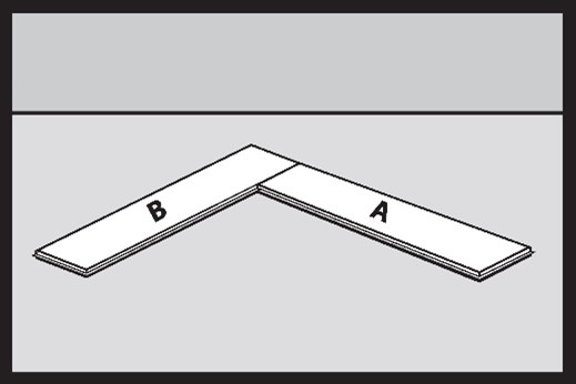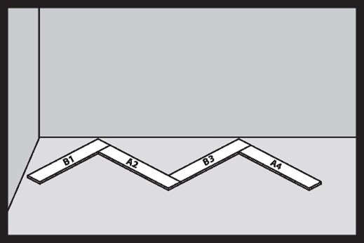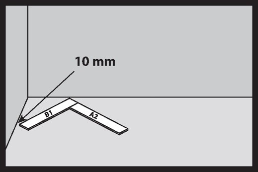 Спочатку прикладаємо ліву панель (B) (1). Права панель (A) монтується другою (2). Кут панелі B1 повинен бути віддалений від стіни на 10 мм (дилатаційний зазор). Це дуже важливо і вплине на подальший правильний монтаж.