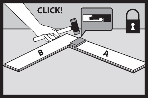 Щоб правильно з’єднати панелі, кожен замок на короткій стороні панелі слід забити безінерційним молотком за допомогою прикладеного зверху бруска.