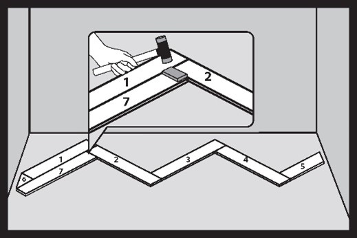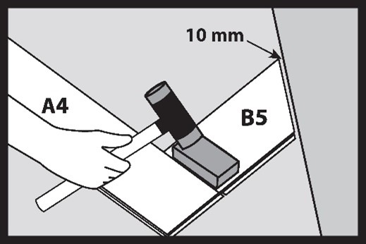 Щоб правильно з’єднати панелі, кожне з’єд-нання на короткій стороні панелі слід забити за допомогою дерев’яного бруска, прикла-деного зверху, і молотка.