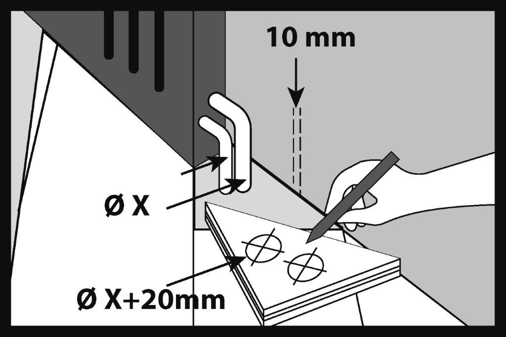 При монтажі підлоги біля труб необхідно вирізати отвори діаметром труб, збільшеним на 20 мм. Це дозволить зберегти дилатацію 10 мм навколо труб.