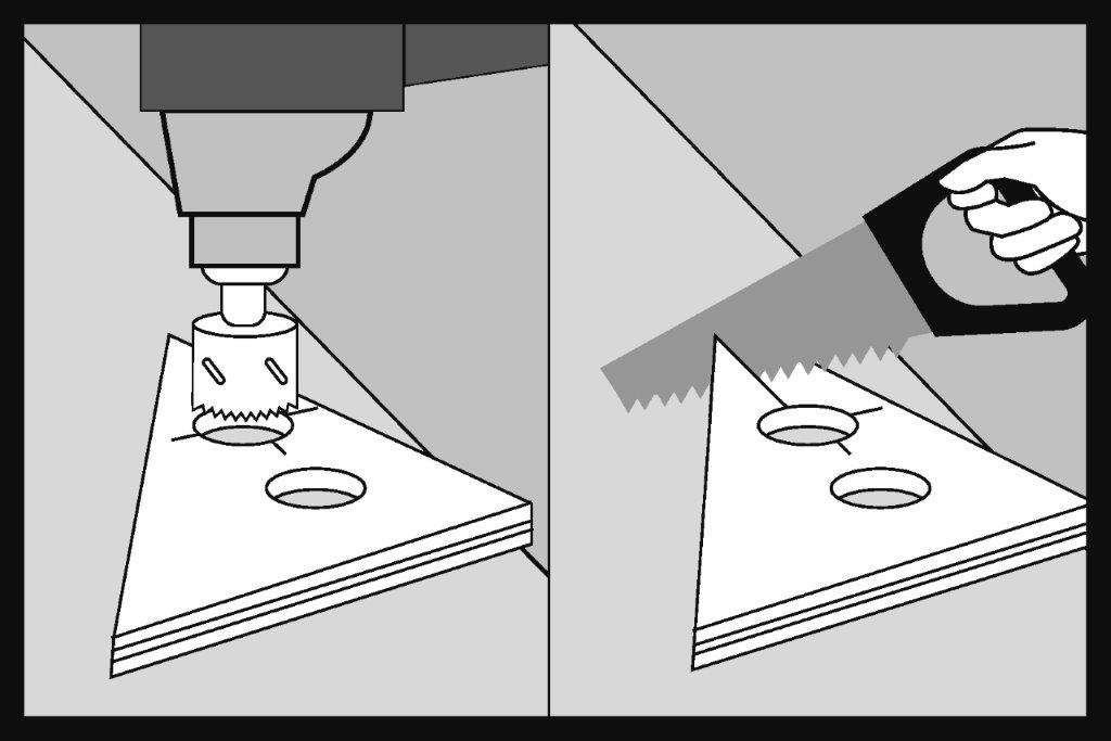 Для вирізання отворів використовуємо сверд-ла для дерева. Розрізаємо панель вздовж діаметра отворів