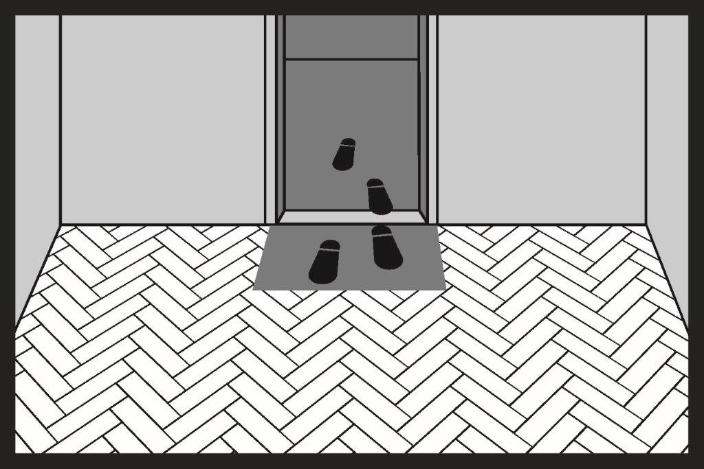 У входах до квартири слід покласти килимки, щоб ефективно запобігти потраплянню піску, землі та води на взуття. Захищайте підлогу, використовуючи килимки зовні та/або всере-дині всіх входів. Килимки будуть збирати бруд, пісок, камінці та інші тверді частинки, а також поглинати вологу. Утримуйте килимки в чи-стоті. Не використовуйте килимки з латекс-ним або гумовим низом на підлозі SPC, оскільки деякі сполуки, що містяться в цих матеріалах, можуть залишити постійні плями або пошкодити панель. Килимки для укла-дання на панелях SPC повинні бути позначені як «незабруднюючі».