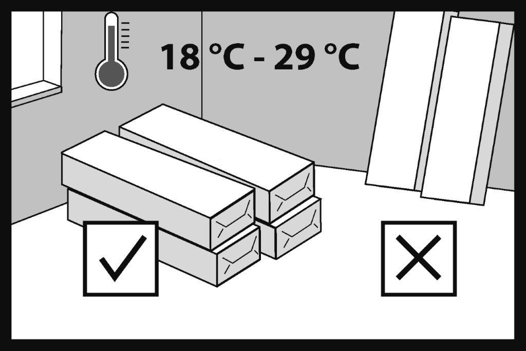 SPC підлогу слід зберігати в оригінальному упакуванні в приміщенні, де її планується укладати, не менше 24 годин, для забезпечення акліматизації. Температура повітря у приміщенні повинна становити від +18°C до +29°C.