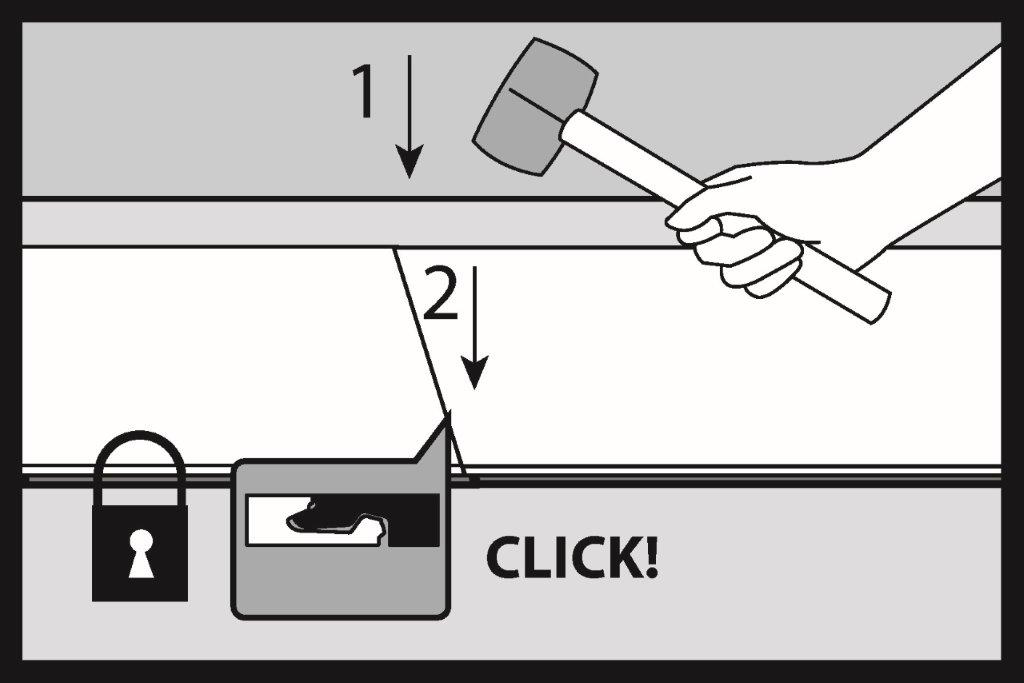 Акуратно добийте з’єднання країв безінерційним молотком з піском або молотком з білої гуми та закрийте замок у зазначеній послідовності 1 і 2. При правильно закритому замку верхній шар панелей повинен знаходитися в одній площині, а між з’єднаними елементами не повинно бути видимих перепадів рівнів.