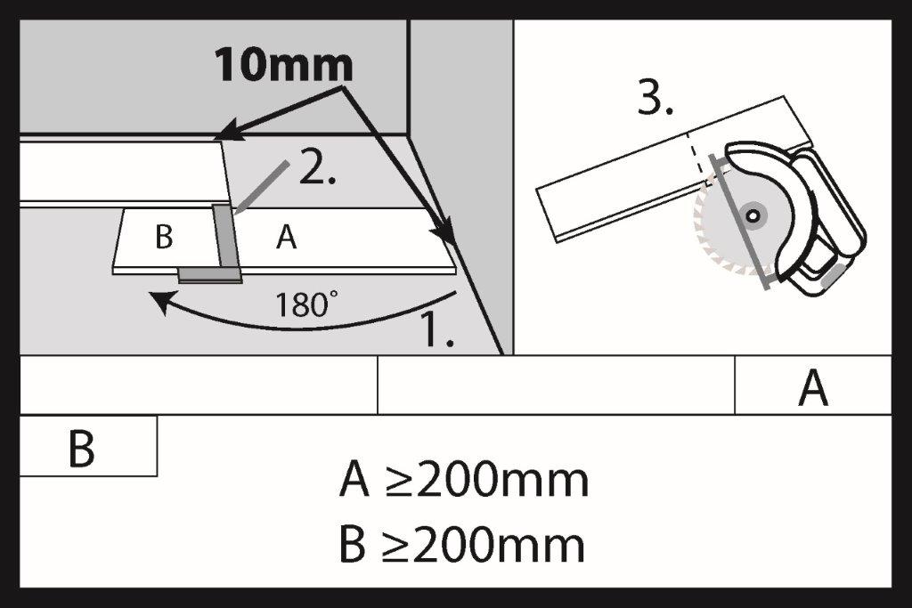 Для різання панелей можна використовувати ручну або електричну пилку. При відрізанні останньої панелі ряду, необхідно залишити компенсаційний зазор шириною щонайменше 10 мм. Рекомендована довжина останньої відрізаної панелі (A) в першому ряду підлоги повинна становити мінімум 200 мм. Якщо відрізаний шматок (B) має довжину понад 200 мм, його можна використати для початку монтажу другого ряду підлоги. Відстань між торцевими з’єднаннями у двох сусідніх рядах підлоги повинна становити щонайменше 200 мм.