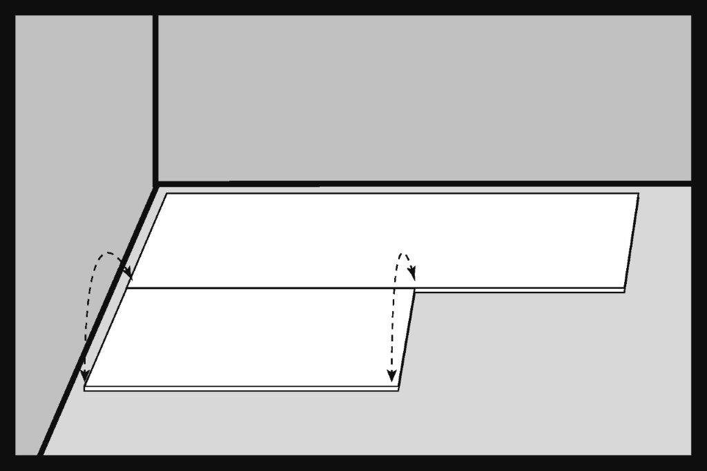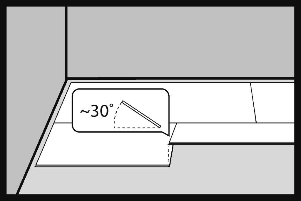 Першу панель SPC у другому ряду підлоги вставляємо під кутом приблизно 30° у замок панелі з першого ряду. Рекомендована довжина встановлюваної панелі SPC повинна становити мінімум 200 мм.