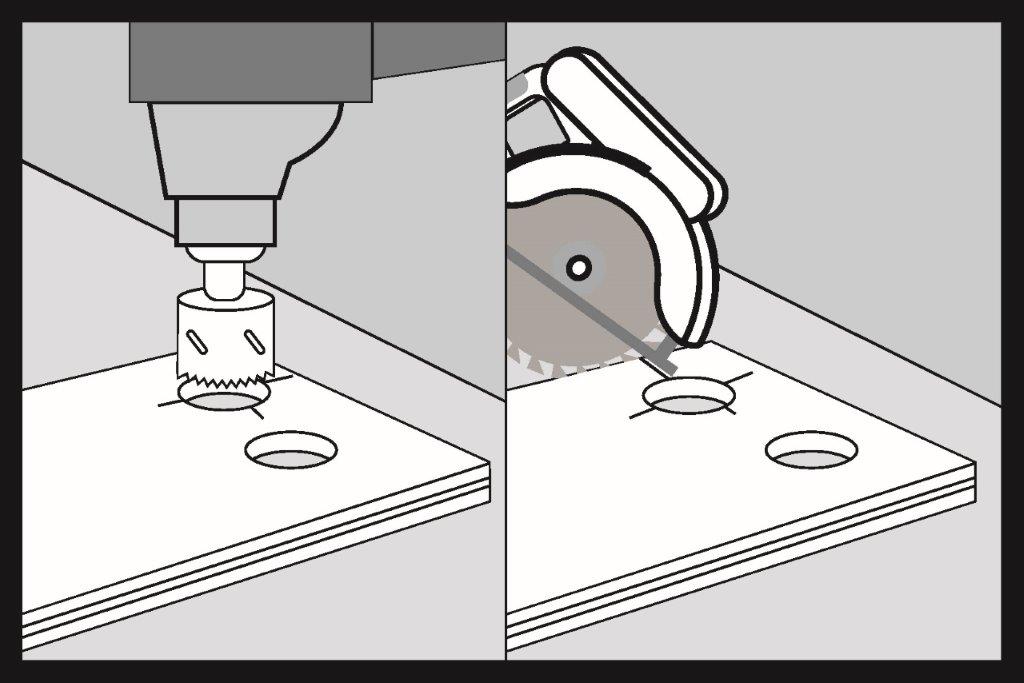 Вирізаємо отвори в панелі SPC. Малюємо лінію через центр отворів і за допомогою пилки розрізаємо панель.