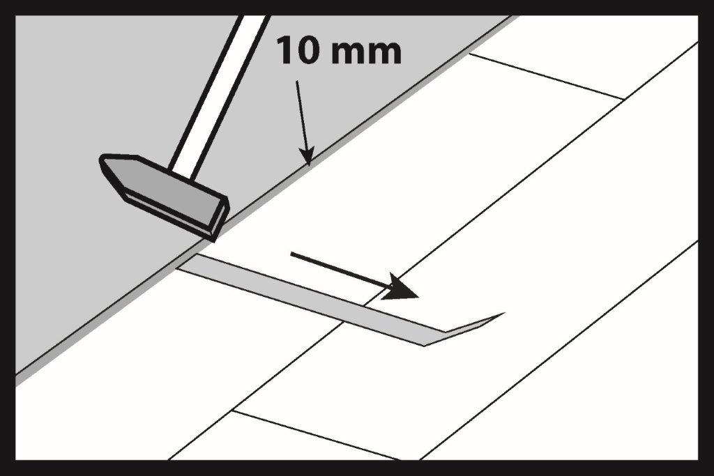 Добийте панель добійником уздовж довгого боку. Під час монтажу завжди добивайте замки на довгому боці.