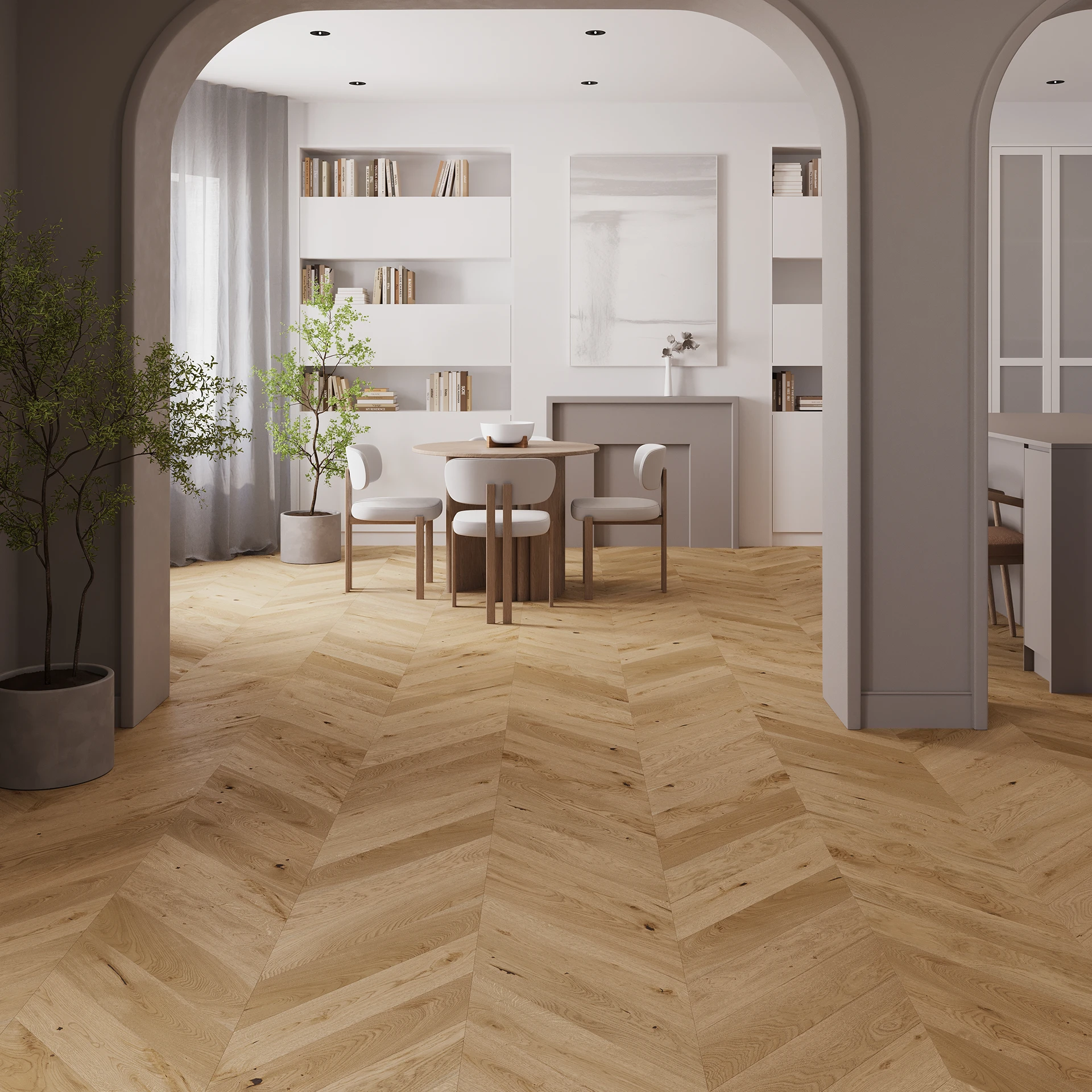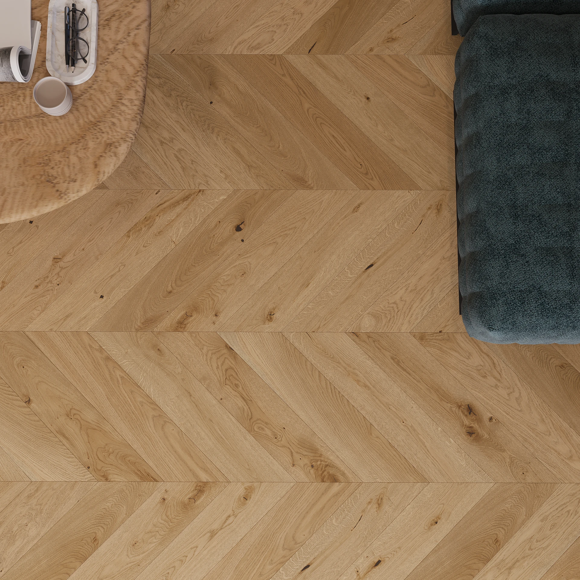 Дубова дошка з сильно вираженими характеристиками деревини, приємним відтінком тепло-коричневого. Підлога піддана процесу брашування, а дошки мають мікрофаску, завдяки яким підкреслено структуру та форму підлоги. Покрита матовим лаком.