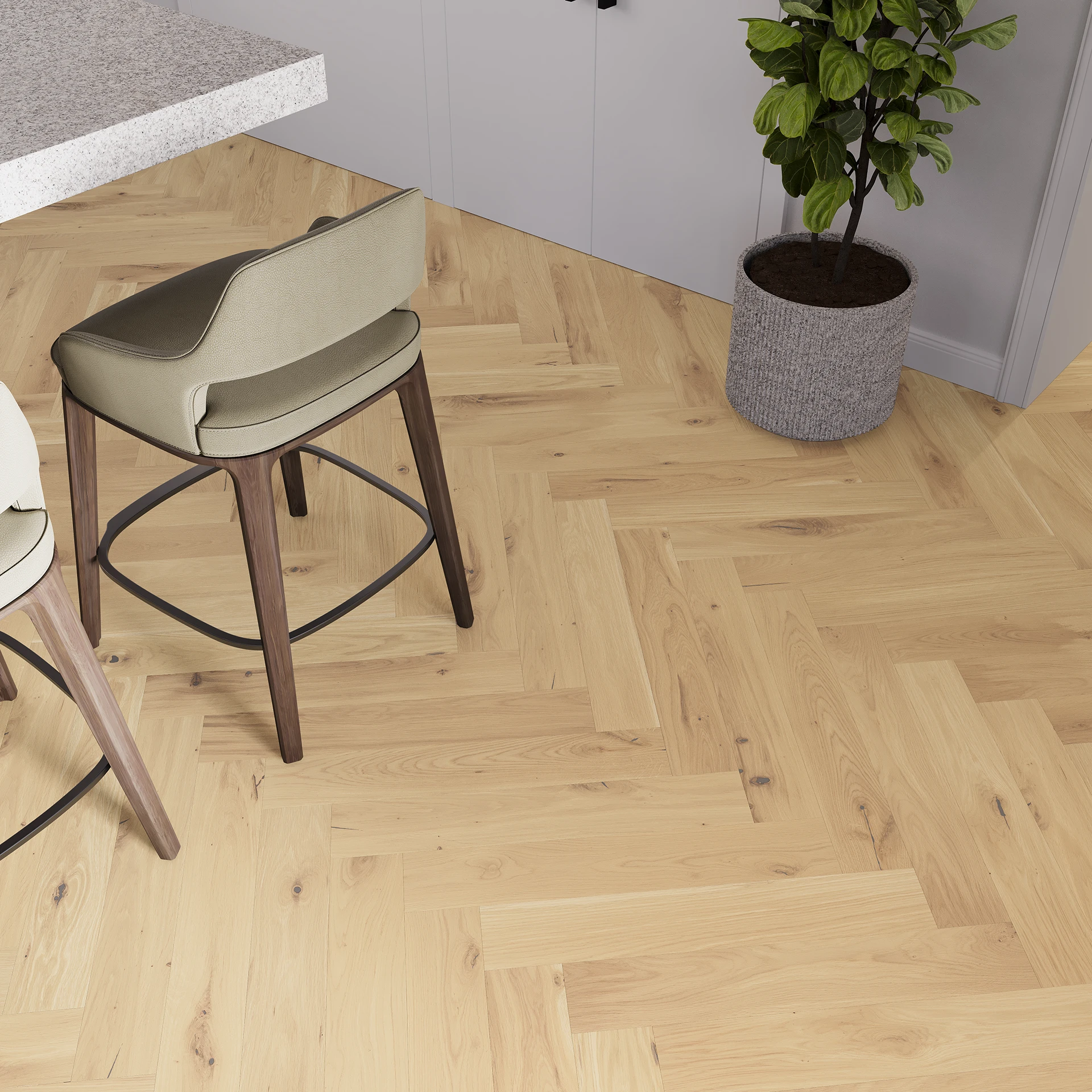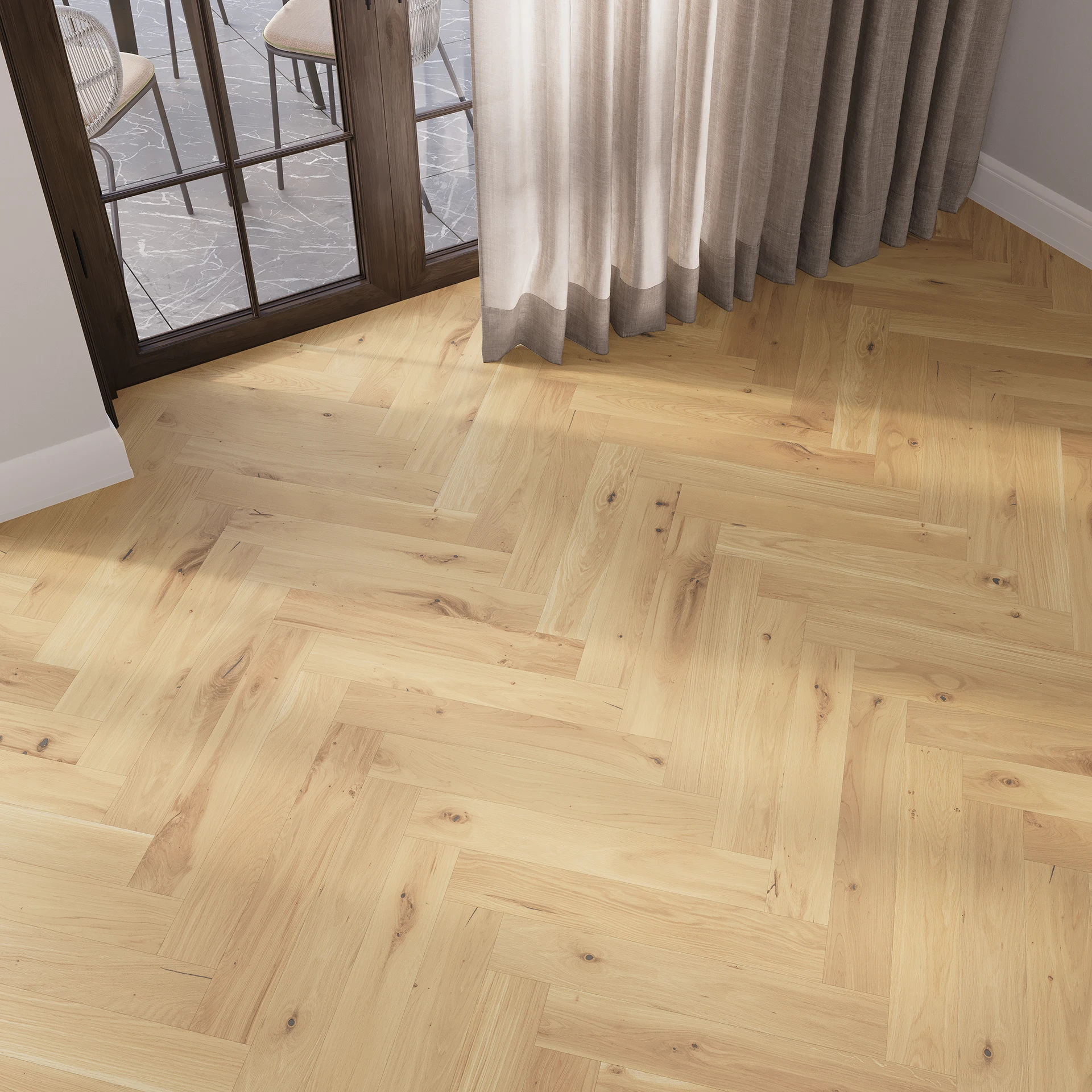 Дубова підлога в кольорі, що імітує непокриту деревину, який був отриманий завдяки унікальному забарвленню. Тонкощі підлоги надала чотиристороння мікрофаска, а малюнок структури підкреслений брашуванням. Захищена натуральним маслом.