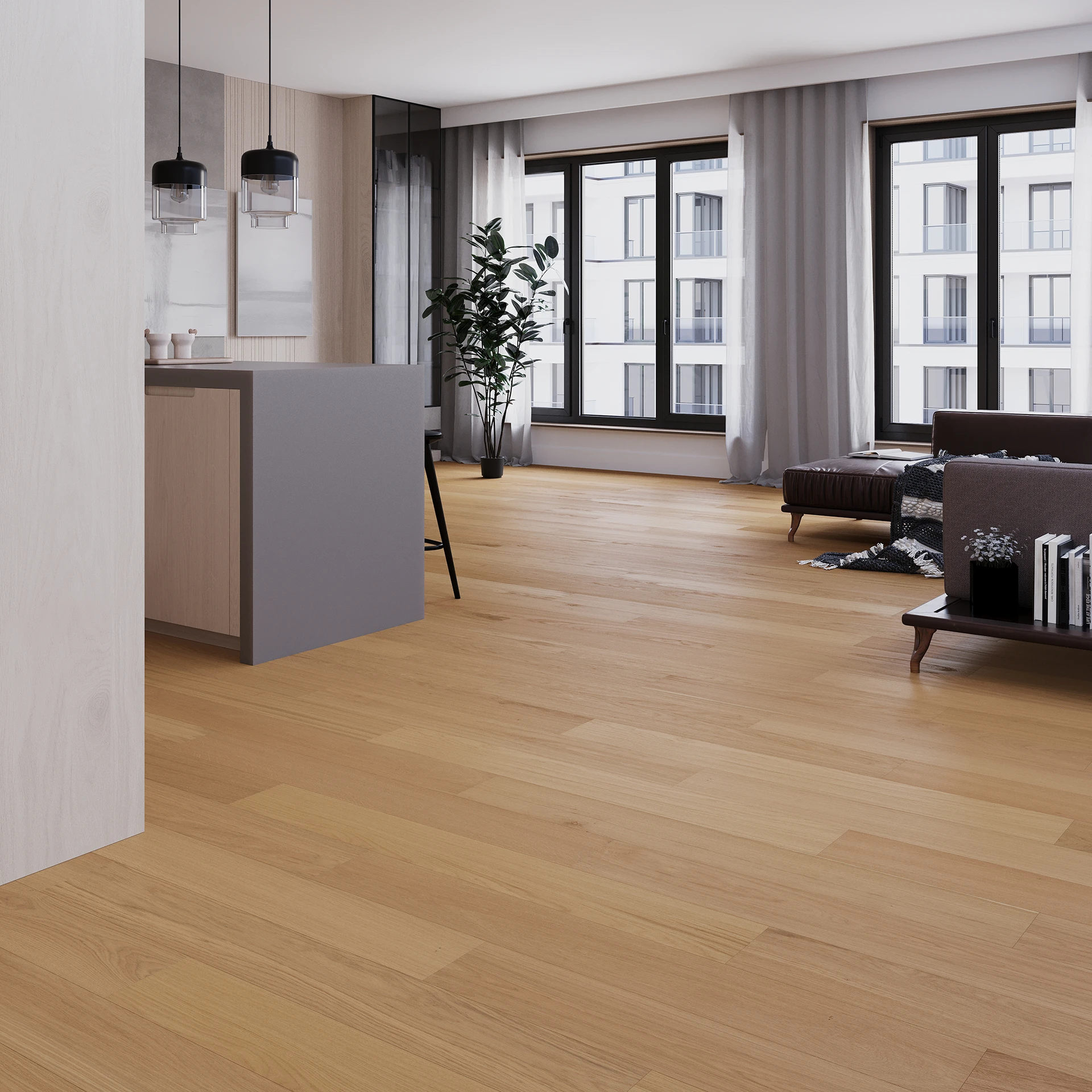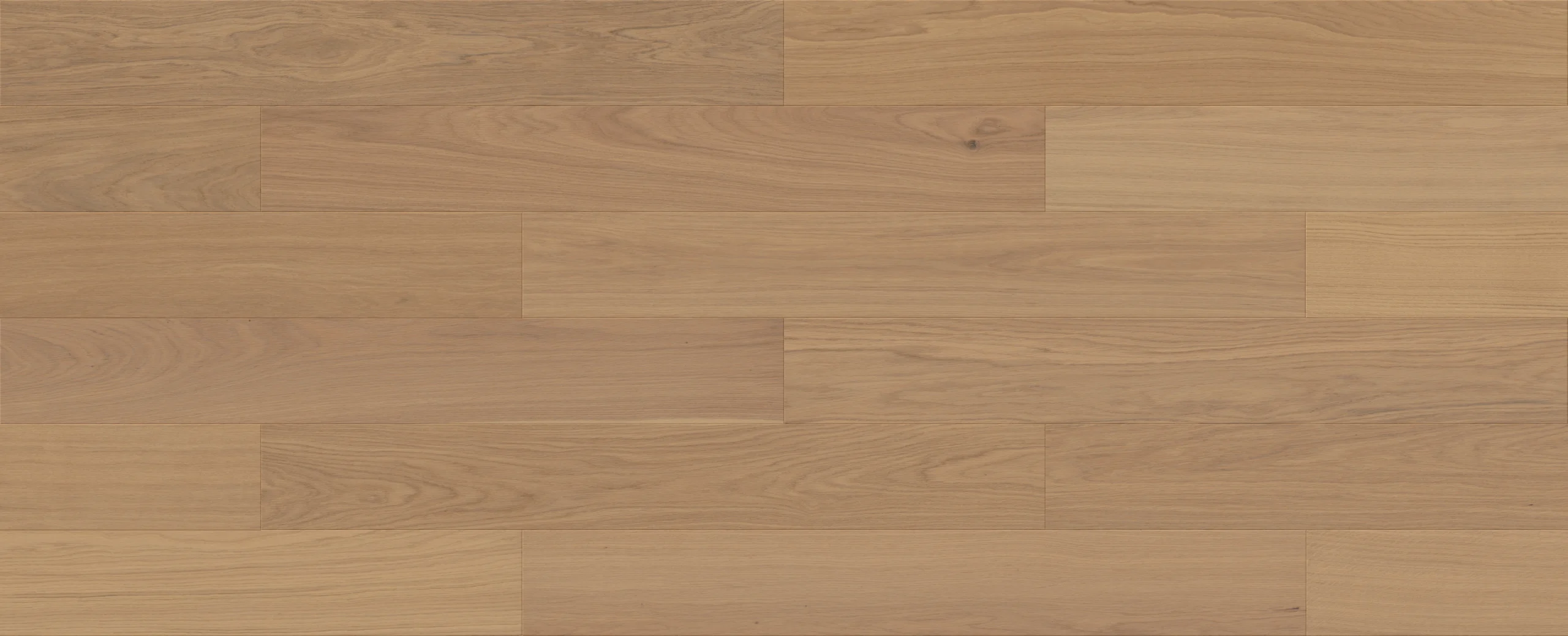 Дубова підлога в легкому бежево-сірому відтінку поєднує сучасну делікатність із природним характером деревини. Нейтральна, стримана барва створює елегантне тло, яке пасує до багатьох стилів інтер’єру.